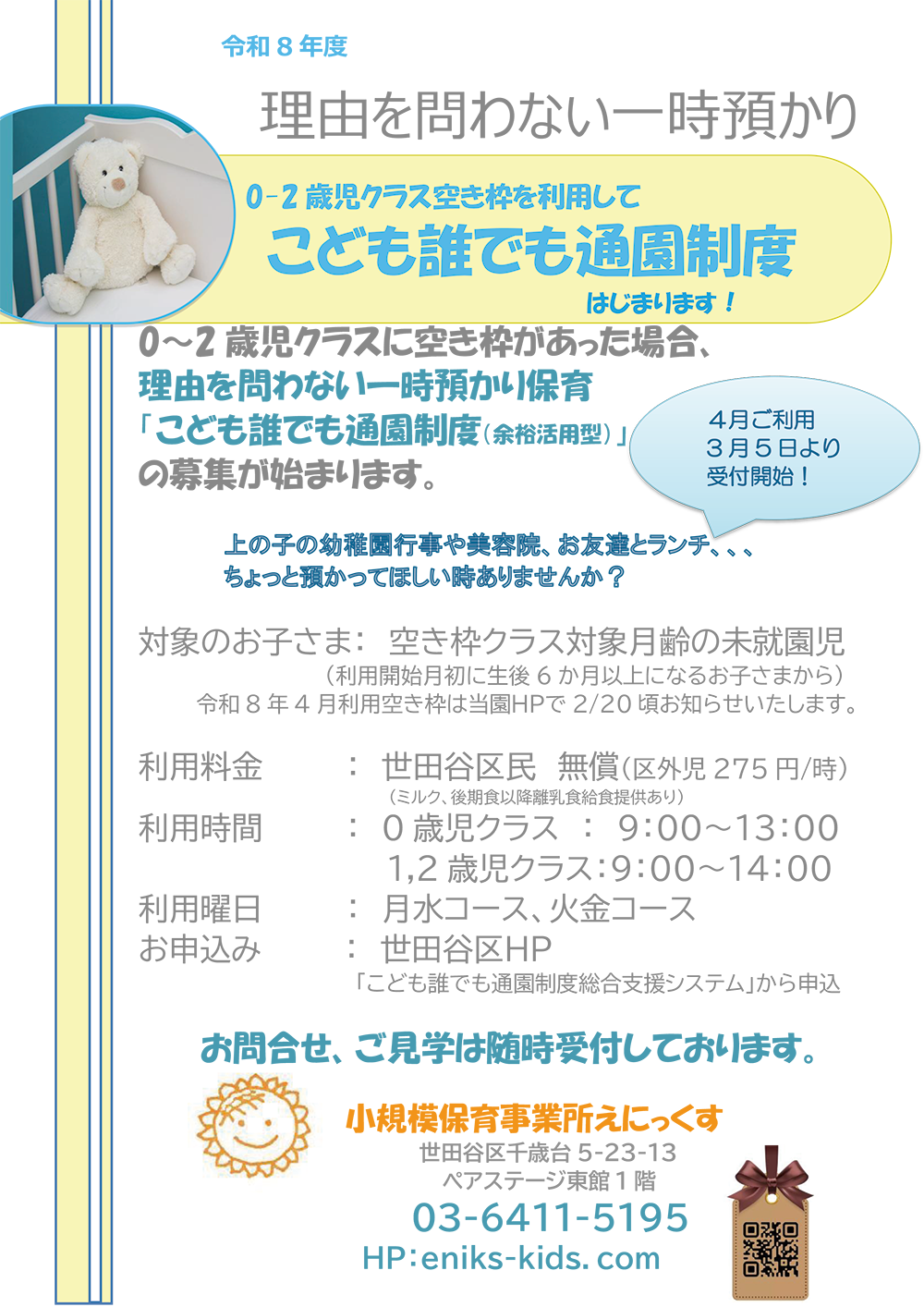 平成28年4月より名称を『小規模保育事業所 えにっくす』と変更し、また、場所を世田谷区千歳烏山から千歳台へ移し、認可保育園として生まれ変わりました。