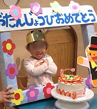 お誕生会は月毎に行わずできるだけその日に行い、そのお子様だけの素敵なお誕生ケーキでお祝いします。保護者の方をお招きしてみんなでお祝いしています。