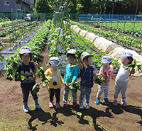 近隣に畑を借り、種から保育園で育てた無農薬の20種類の野菜を、年間通して様子を見たり お水をあげたり 収穫を楽しんだり、採れたてをいただいたりして食育を行います。子どもたちも一緒に育てた野菜ですから、苦手だった子も食べられるようになることが多く見られます。