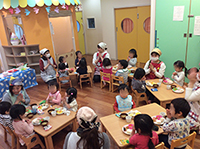 また、0歳クラスでは手づかみ食べの時期に食材を手で触ってみる「食材触感遊び」や、1歳クラスでは「パンつくり」、煮えているところが見えるように透明な鍋を使って材料を子供達がちぎって入れる「スープ作り」、2歳クラスでは「クッキー型抜き」や「ピザ作り」、年度末には子どもたちがお店屋さんになる「お楽しみ給食」など、年間をとおしてクラスごとの育ちに合わせた食育を行っています。